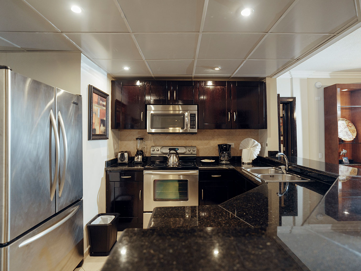 Enjoy a dramatically decorated, fully-furnished living and kitchen area featuring stainless steel appliances and designer furnishings along with lovely shaded balconies and verandas.