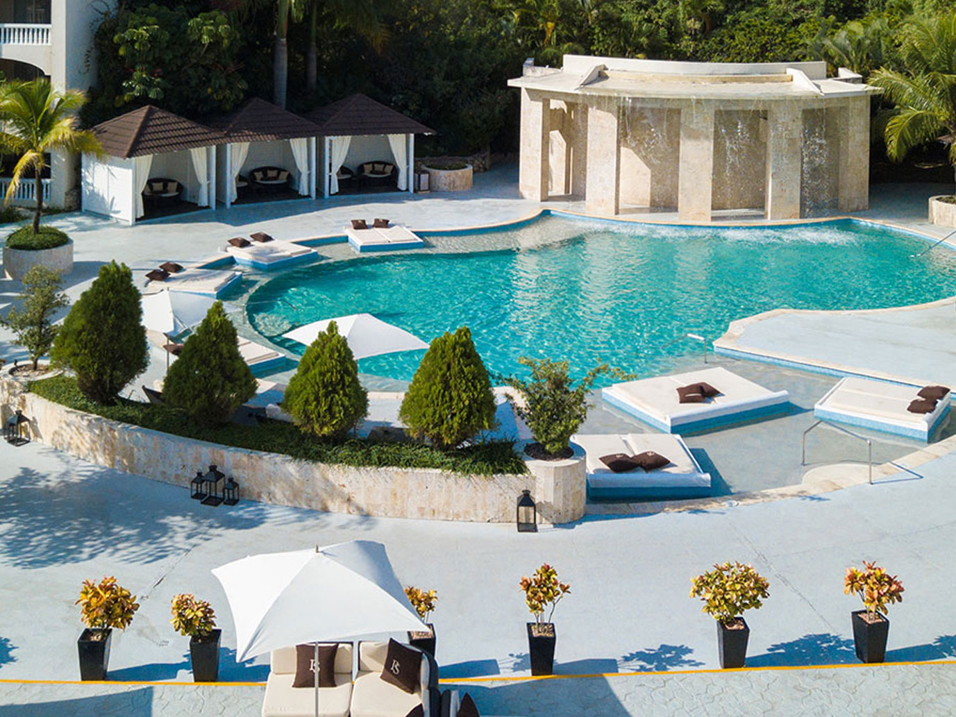 The centerpiece of the resort is a large centralized pool with a waterfall, surrounded by tropical gardens, offering a tranquil oasis for relaxation.